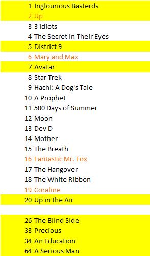 Again, there are four animated films in the top 20 of the year, but this time only five of Oscar’s picks match the general public. If you were picking out animated films, then you’d have put at least one more in that list. Shamefully, Mary and Max didn’t even make the cut for Best Animated. Even The Princess And The Frog, which wasn’t one of Disney’s more memorable efforts, came higher up the list than A Serious Man.