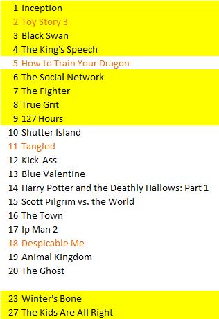 The films in gold background are the ten Best Picture nominees; those in darker gold text are animated films. If the general public had their say, then How To Train Your Dragon would have made the cut and Tangled, which was ahead of Shutter Island as recently as last week, would also have been in with a shout.