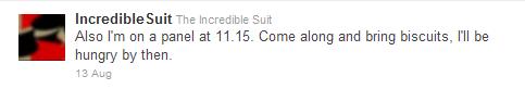 the only sensible and decent thing to do seemed to be to take the man some biscuits. After 30 or so seconds of internal biscuit debate, I settled on a packet of Chocolate Hob-nobs. The debate wasn’t exactly fiery, and seemed to settle on “critics should write true to their heart, and you should find one you like the views of to follow, and one you like to read the style of but don’t like the views of for contrast”, which is fair enough. I don’t think Karen Krizanovich liked my questions, or possibly she has a biscuit allergy of some sort, but it felt like she was giving me evils for the last ten minutes. Anyway, it was worth it just for this:
