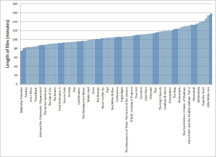 If you log into IMDb, then go to the MyMovies link (as circled above), you’ll find quite a comprehensive list making functionality. You can rate your films out of ten, and then make them into lists; there’s also a Watchlist, so you can even make a generic list of what you’re going to watch and then move it into your latest list when you’ve seen it. When you’ve made a list, you can then export it into something such as a spreadsheet package, where you can make various graphs of your pointless achievements to bore your friends with. Here’s another one to show how pointless you can be – a bar graph showing all the lengths of the films I saw last year, sorted from shortest to longest. Lovely.