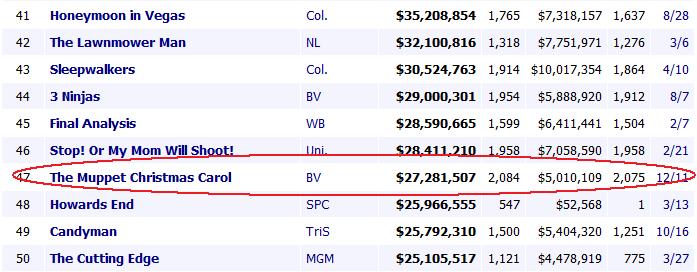 But The Muppets Christmas Carol is a classic Christmas movie, even if, like many of its contemporaries, it didn’t grab audiences at the time. It’s A Wonderful Life wasn’t truly appreciated in its own lifetime, only finding life on cable TV re-runs many years later, and similarly The Muppets Christmas Carol struggled to find an audience first time round. Look at the box office chart (courtesy of Box Office Mojo) for 1992 for the US: