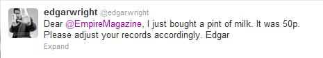 But still something felt wrong. Unfinished business. The Edgar Wright question still burned me at the back of my head, an irritating reminder of not only my own weakness, but also of his. 99p? Hewitt was right, I’m not even sure Hollywood cows are charging that much these days. Had he really lost touch with reality that much? Had the West Country lad who’d become a geek idol gone so far from his roots? Was it all worth it if that was the case, was fame, fortune and an enviable abundance of talent too much of a price to pay for losing track of the simple things in life? Then yesterday, on Twitter: