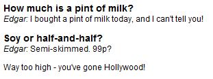 “I’m sorry I don’t have a better question for you Mr O’Malley but Edgar, you’re about the same age as me and seem to have achieved so much, I feel I’ve kind of wasted my life and the only thing that will leave me something to hang on to is the thought that you no longer remain grounded in reality. So please answer me this one question: how much is a pint of milk?”