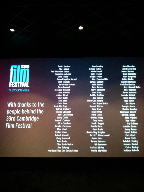 The other thing that Day 1 had brought was some unexpected recognition of my behind the scenes support, as part of a cast of dozens that help to make the festival what it is. While my contribution was fairly minimal compared to some of those that work full time for much of the year to bring these eleven days of cinematic heaven to the public each year, everyone is equally rewarded when it comes to thanking those involved, and a giant caption displayed before each film lists the names of those involved. The past year of my involvement in film activity in and around Cambridge means that a significant proportion of these names are now people I know and talk to regularly, and it’s had the effect of making the festival that much more interactive, and even more enjoyable for a fledgling film geek like myself.
