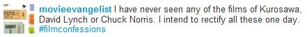 I’m also a Twitter addict, and will happily get caught up in any of the latest trends. So when the #filmconfessions hash tag started yesterday, I chipped in with:
