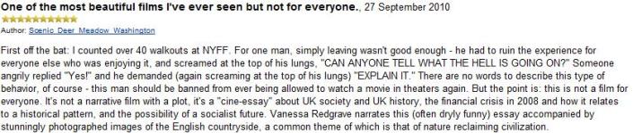 This trailer is, in its own way, very similar to the Jackass trailer, in that it sets its stall out, and is almost as keen to tell you about the quality of what you’ll see as the content. (I have to say I like the latter part of that approach; no-one wants to see too much given away in the trailer.) I have to confess that I only saw my first Mike Leigh movie two years ago, when I was on my first all-out cinema binge, and it was a pleasure then – I’m sure it’s going to be a pleasure now as well.